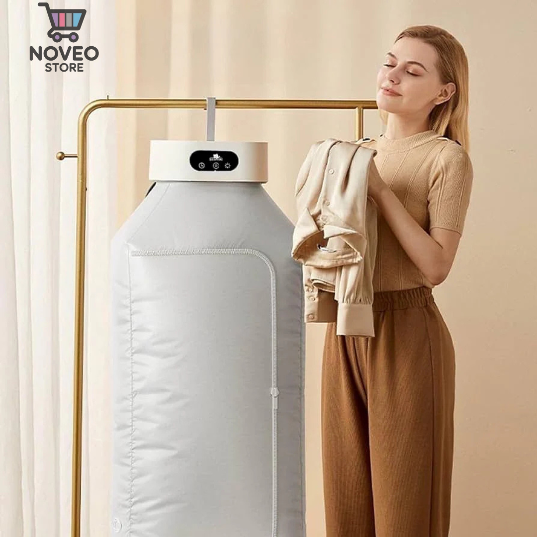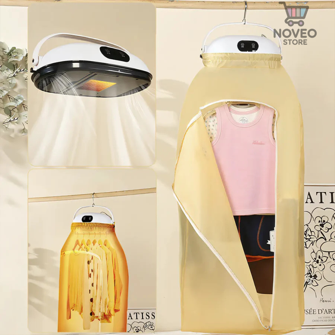 SECADOR DE ROPA PORTATIL COLGADO: Este dispositivo combina un sistema de calefacción (generalmente PTC o cerámico) con una bolsa o funda plegable que permite introducir prendas mojadas colgadas de perchas. El secador distribuye aire caliente de manera envolvente (360°), logrando un secado uniforme desde todos los ángulos y evitando puntos fríos.